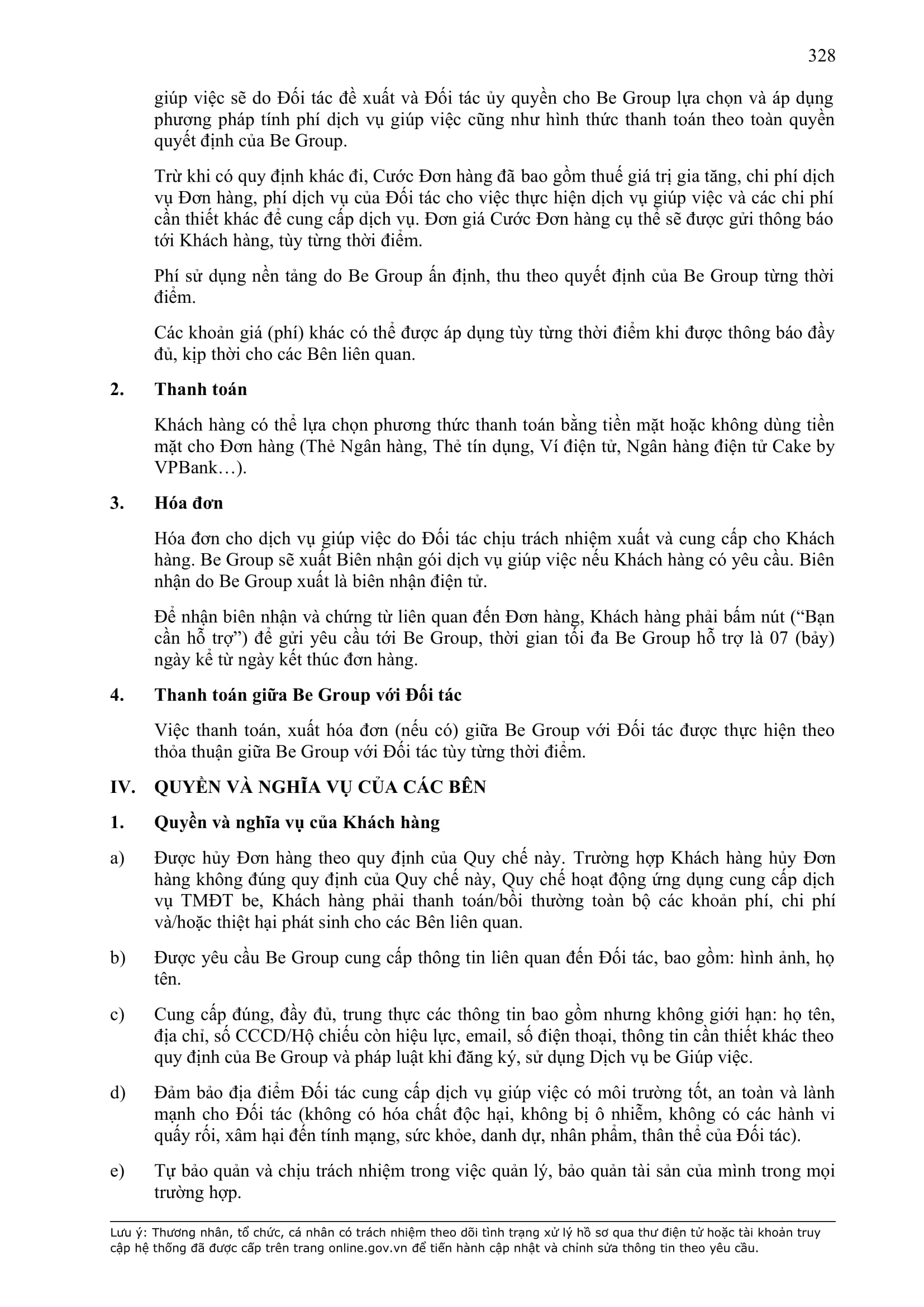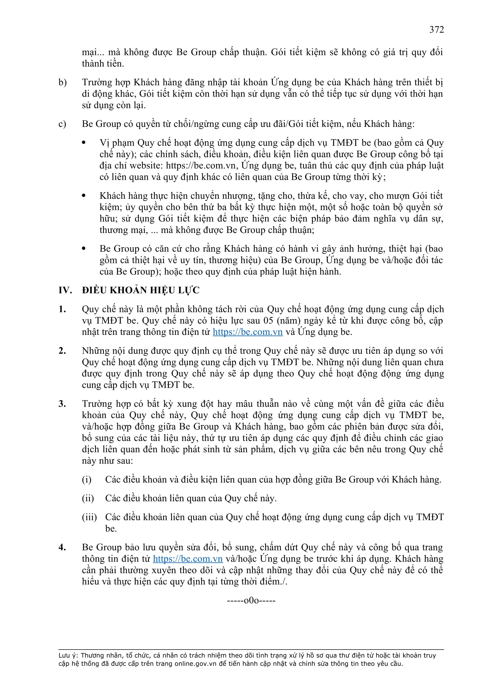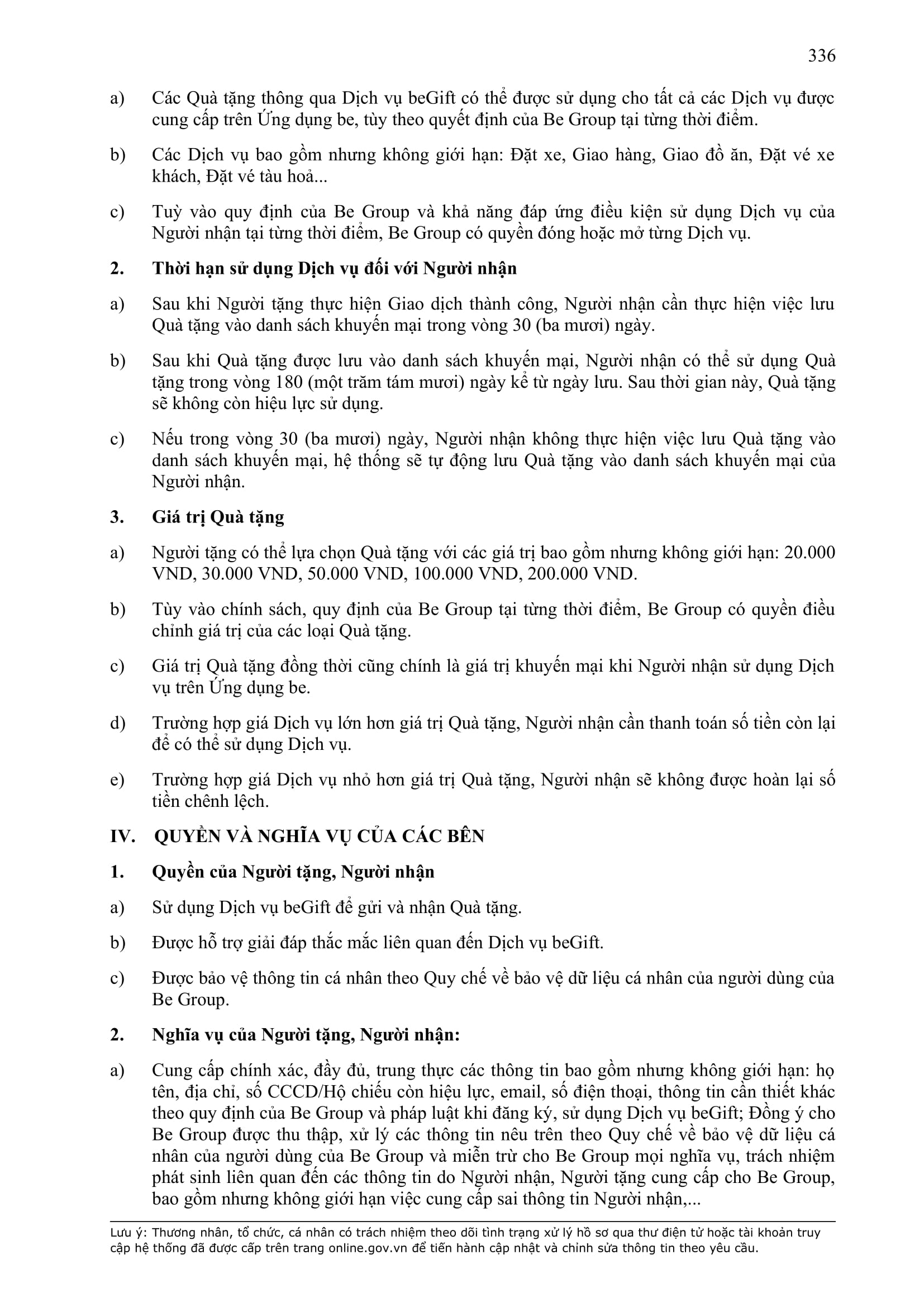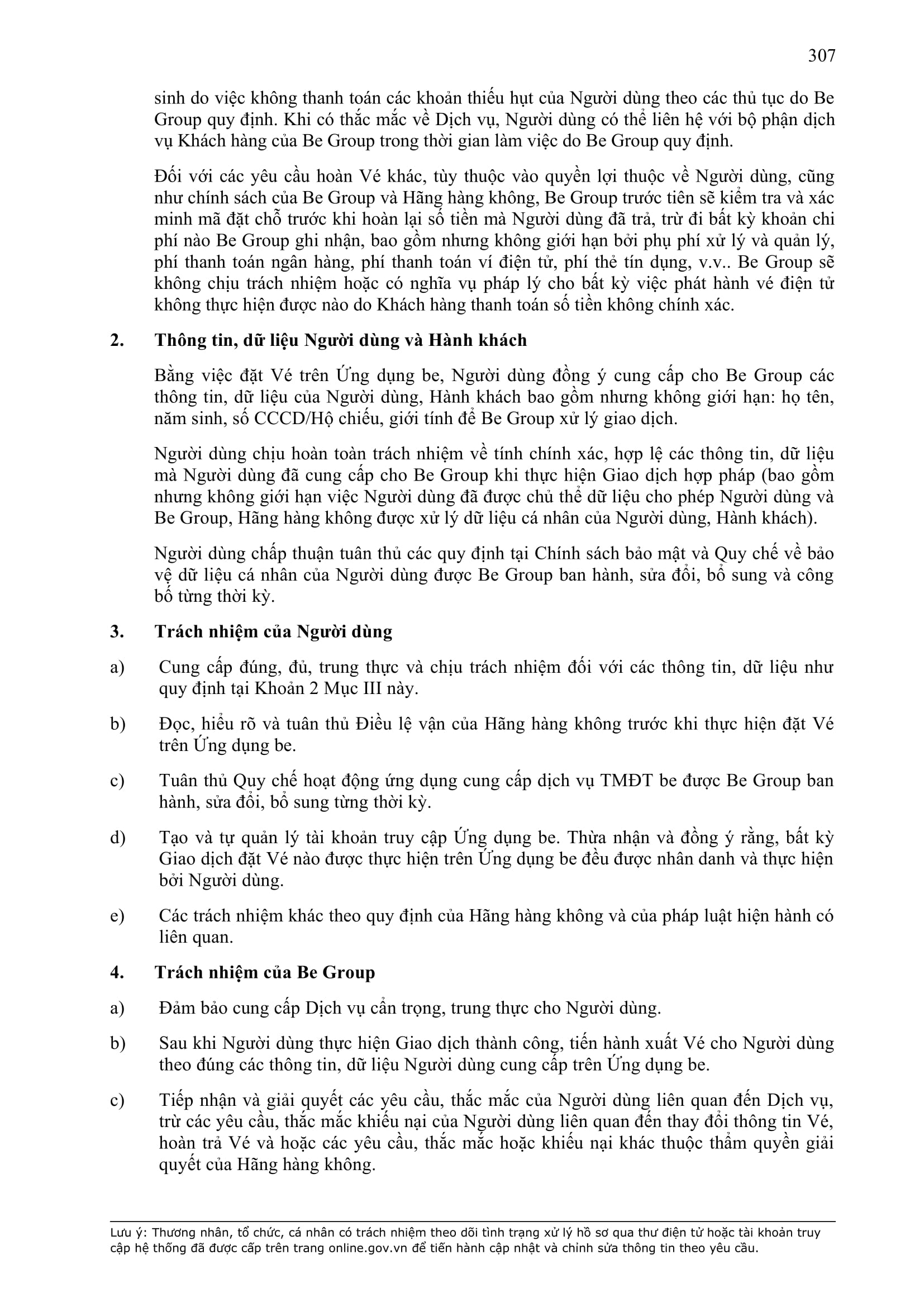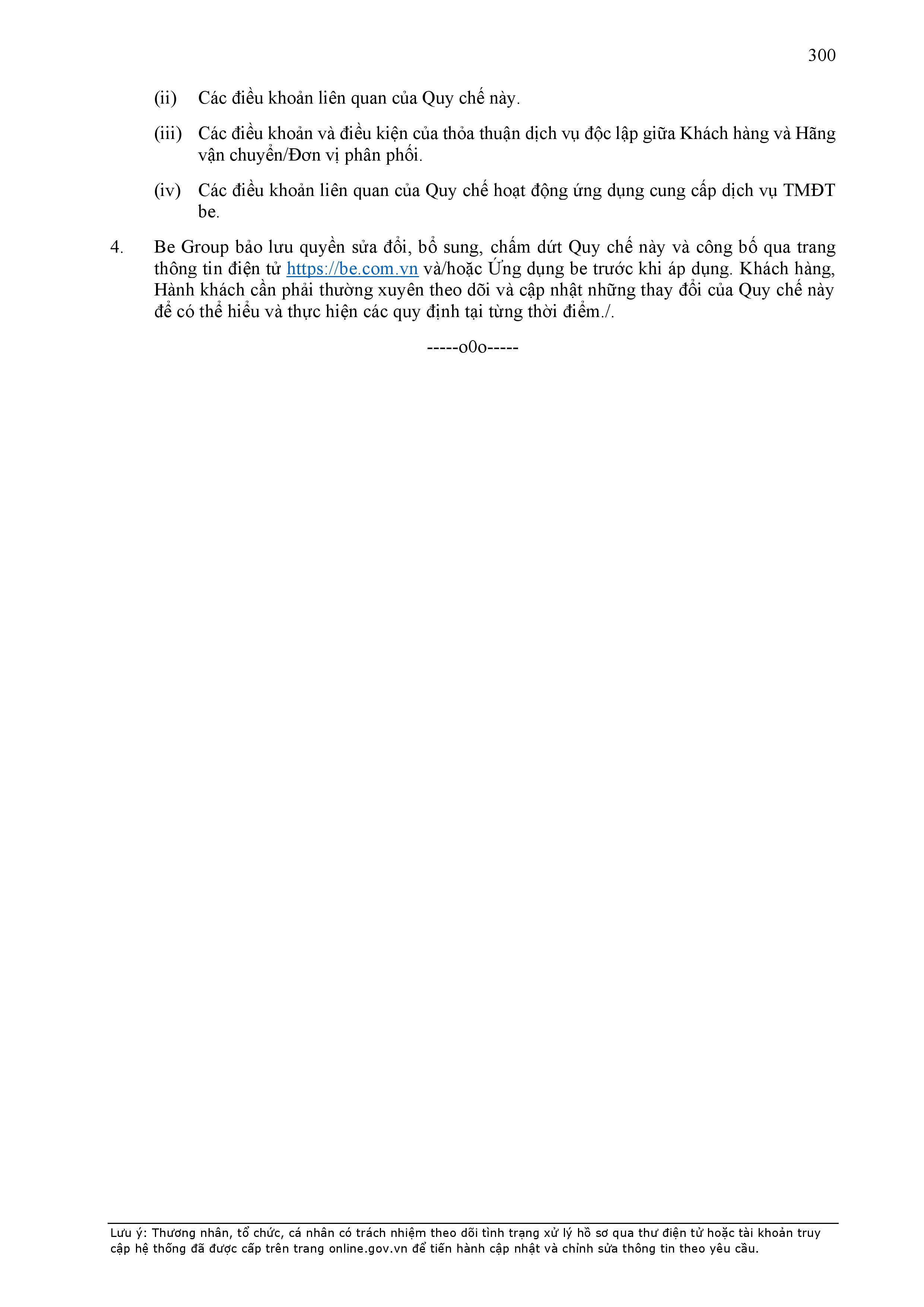 - Tuân thủ đầy đủ, đúng các quy định đã thỏa thuận tại Hợp Đồng này, quy định của pháp luật; chính sách, quy chế, quy định, điều khoản sử dụng, chuẩn mực dịch vụ, Quy chế hoạt động ứng dụng cung cấp dịch vụ TMĐT be (bao gồm cả Quy chế về bảo vệ dữ liệu cá nhân người dùng, Bộ quy tắc ứng xử…) được công bố tại website: https://www.be.com.vn, Ứng dụng be và/hoặc theo thông báo của BE GROUP và/hoặc Đơn Vị Vận Tải tại từng thời điểm.