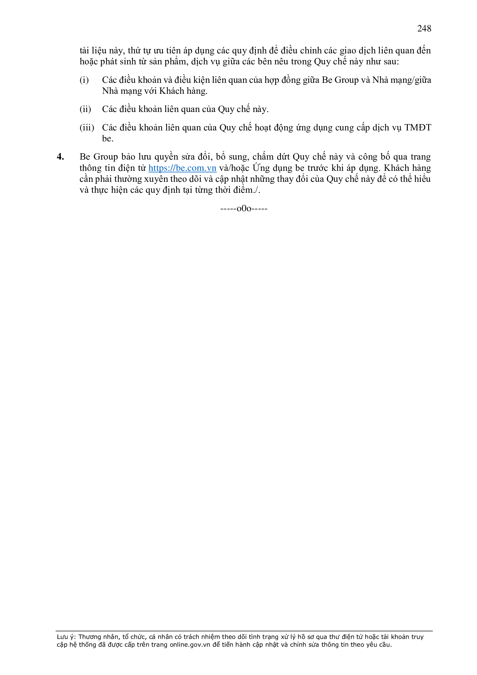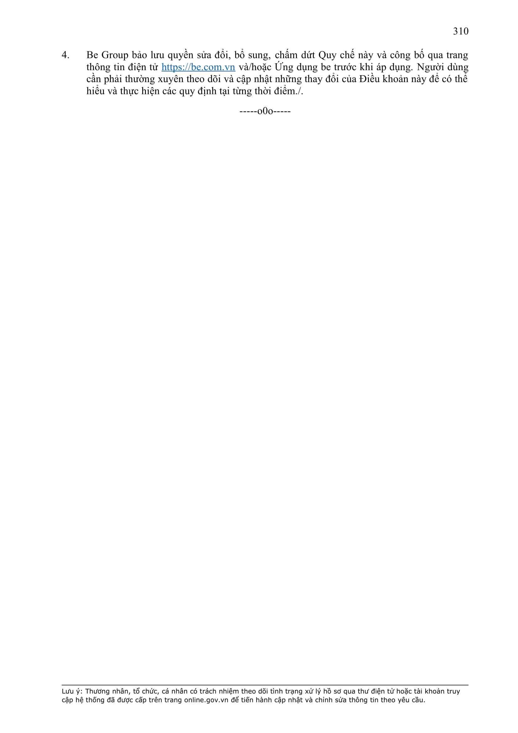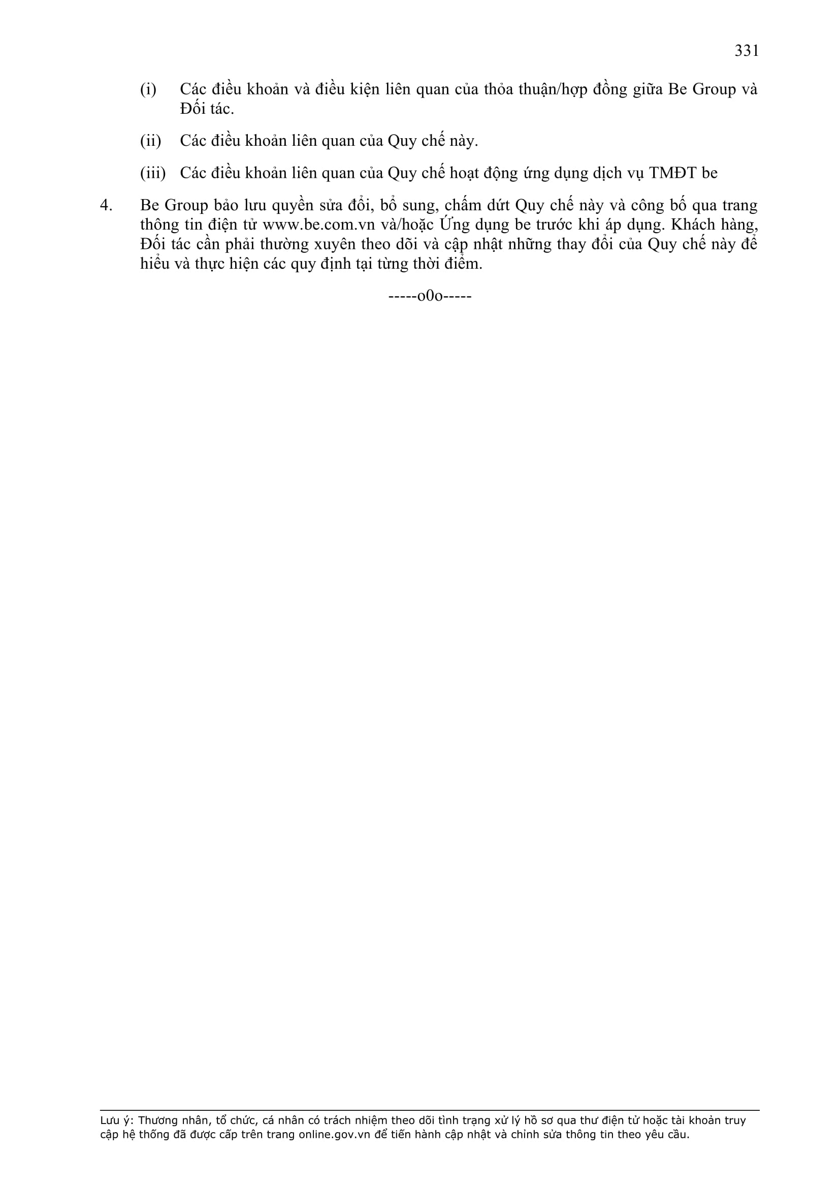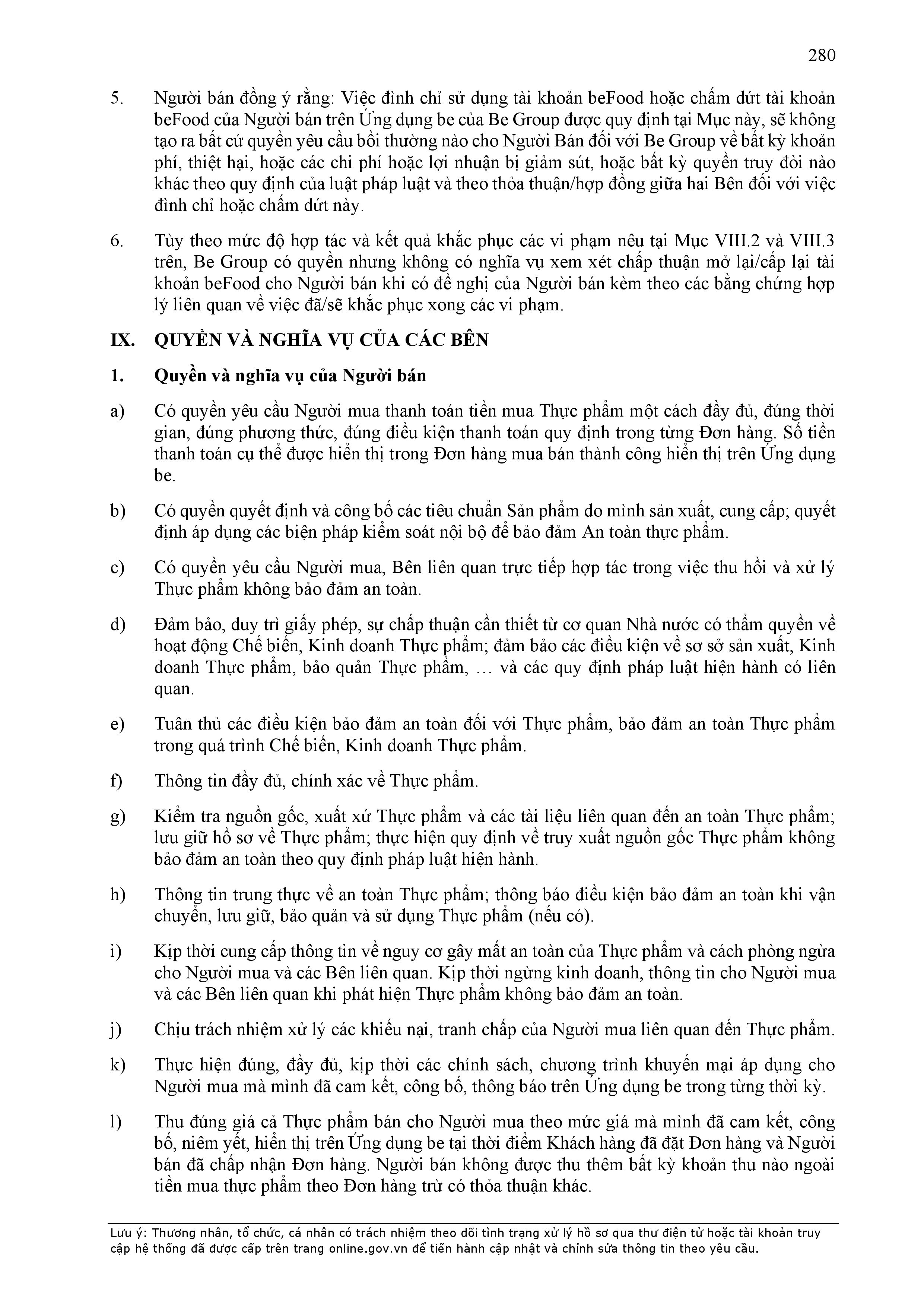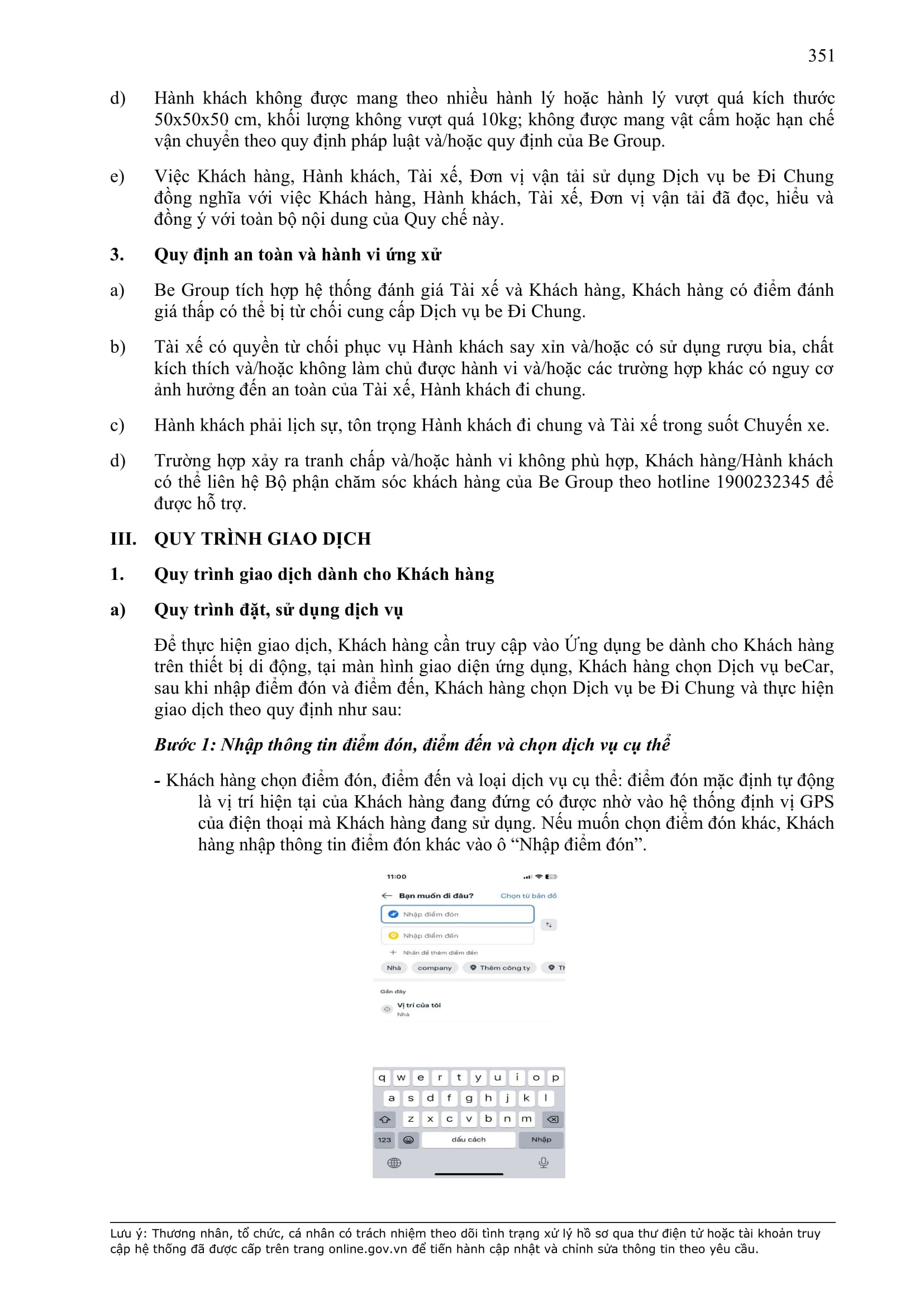 - Tuân thủ đầy đủ, đúng các quy định đã thỏa thuận tại Hợp Đồng này, quy định của pháp luật; chính sách, quy chế, quy định, điều khoản sử dụng, chuẩn mực dịch vụ, Quy chế hoạt động ứng dụng cung cấp dịch vụ TMĐT be (bao gồm cả Quy chế về bảo vệ dữ liệu cá nhân người dùng, Bộ quy tắc ứng xử…) được công bố tại website: https://www.be.com.vn, Ứng dụng be và/hoặc theo thông báo của BE GROUP và/hoặc Đơn Vị Vận Tải tại từng thời điểm.