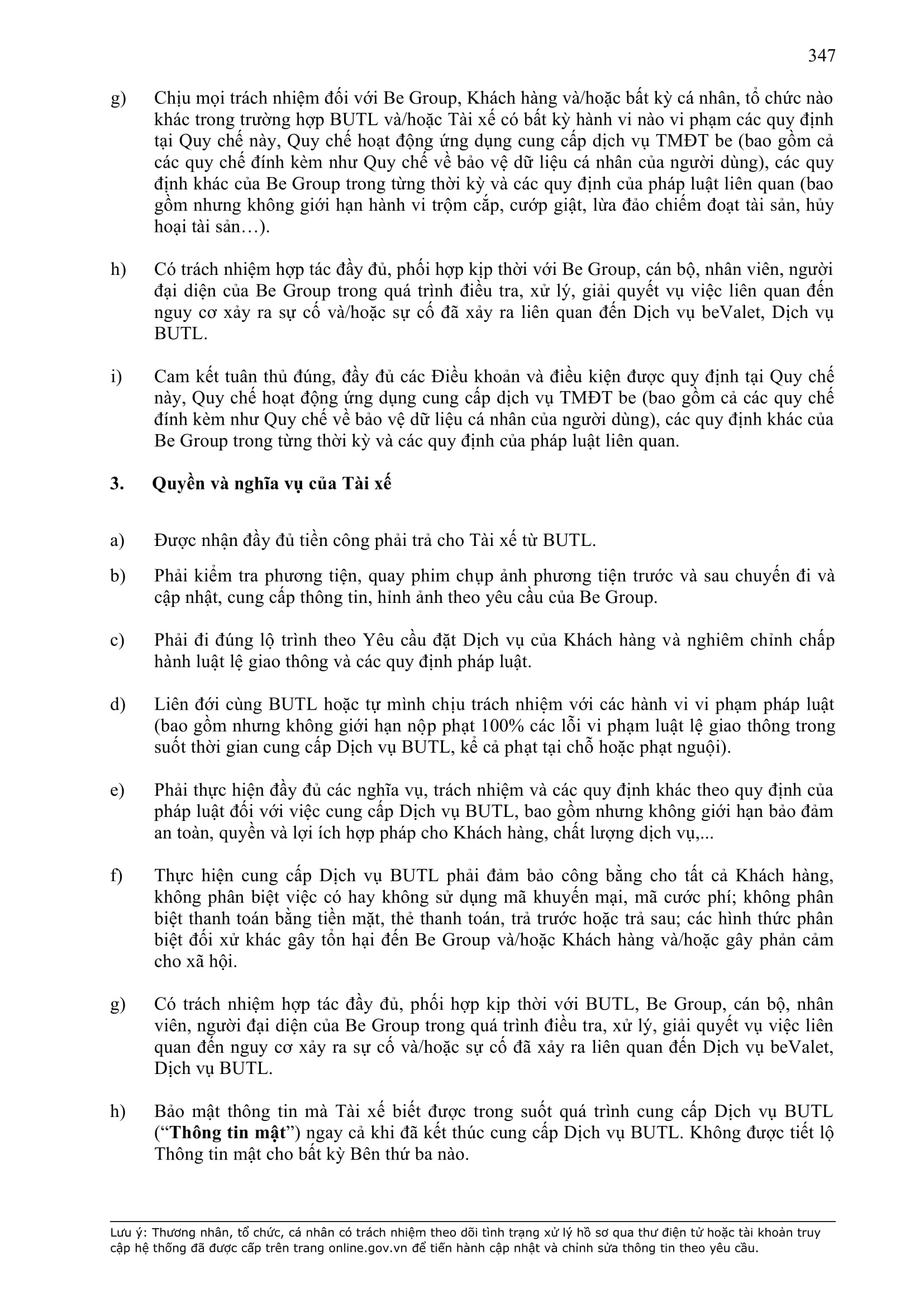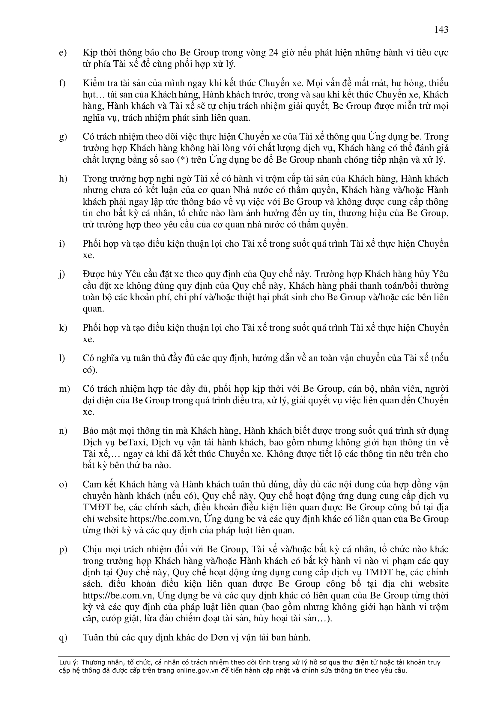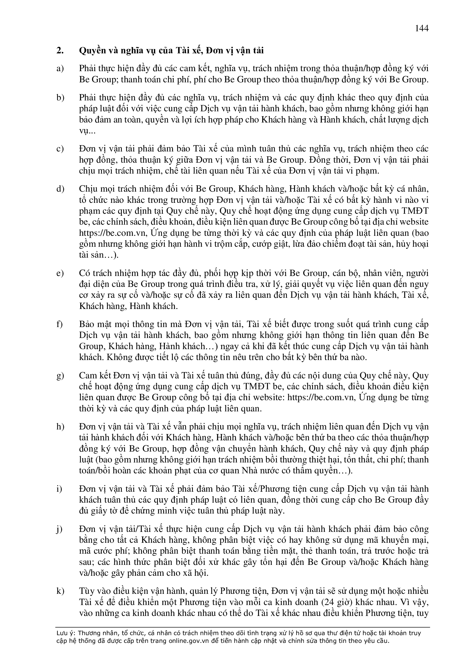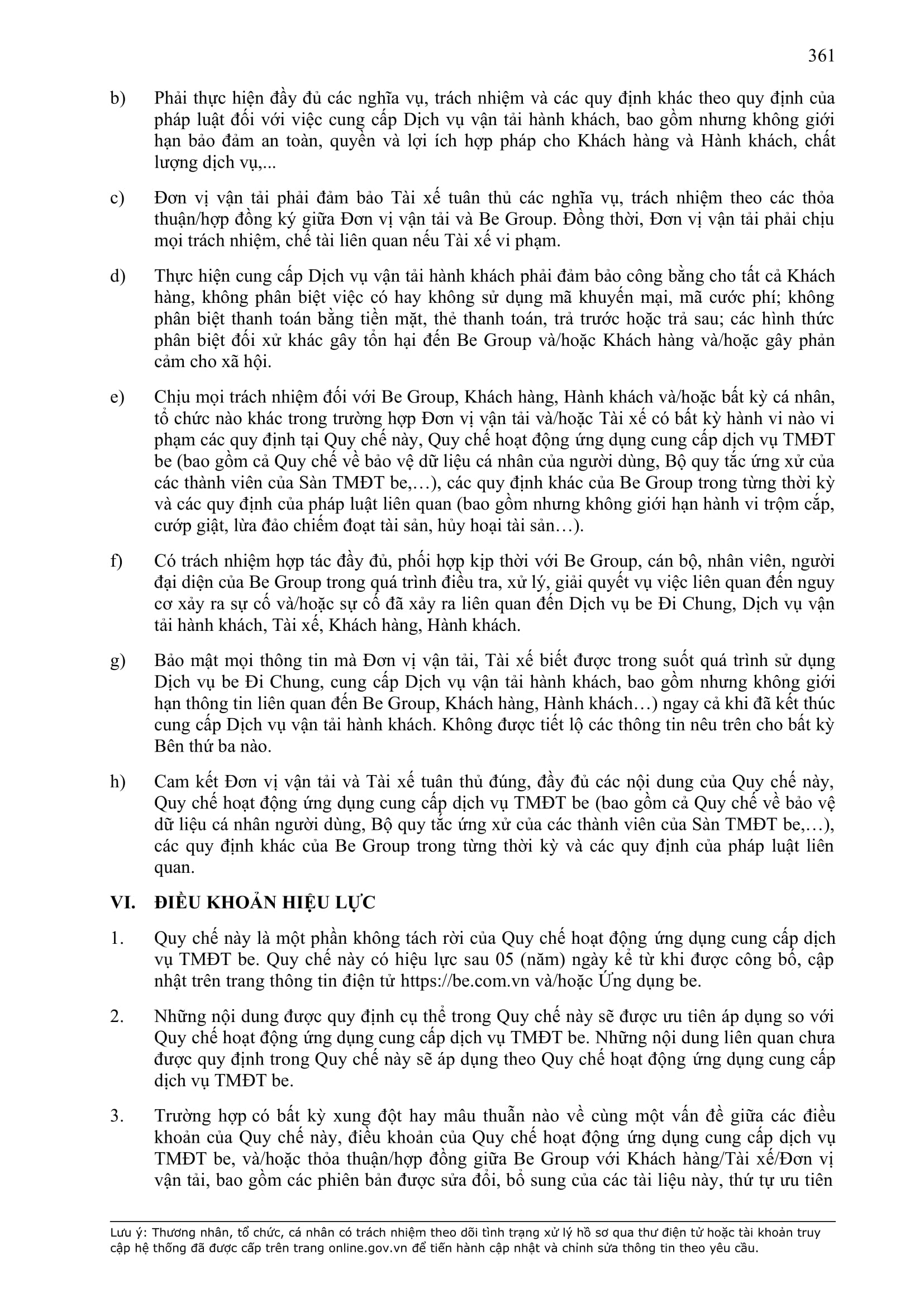 - Các nghĩa vụ, trách nhiệm khác theo Hợp Đồng này, các hợp đồng/thỏa thuận ký giữa Đơn Vị Vận Tải và BE GROUP, quy định pháp luật, Quy chế hoạt động ứng dụng cung cấp dịch vụ TMĐT be (bao gồm cả Quy chế về bảo vệ dữ liệu cá nhân người dùng, Bộ quy tắc ứng xử…), các quy định, quy chế khác của BE GROUP trong từng thời kỳ.