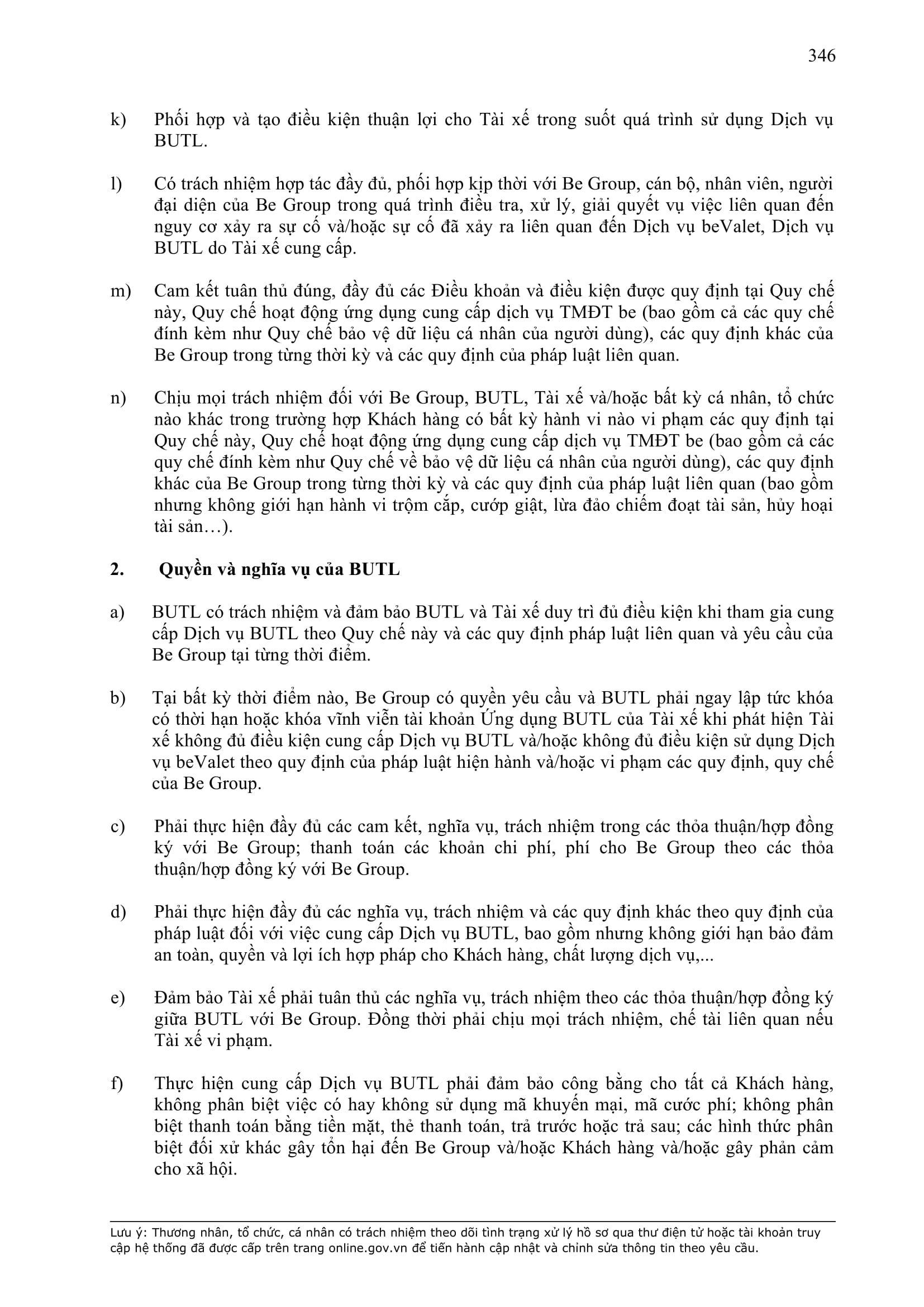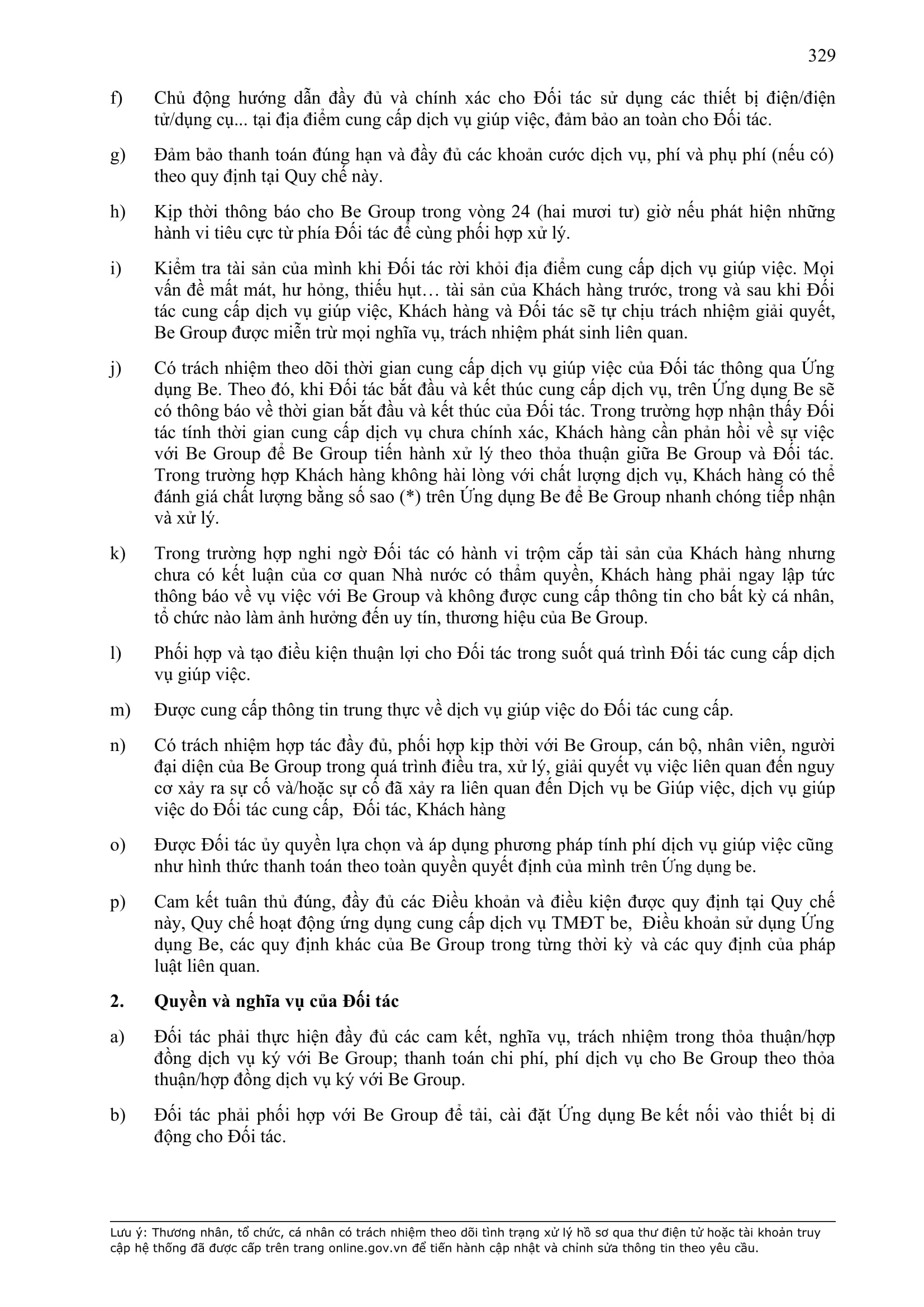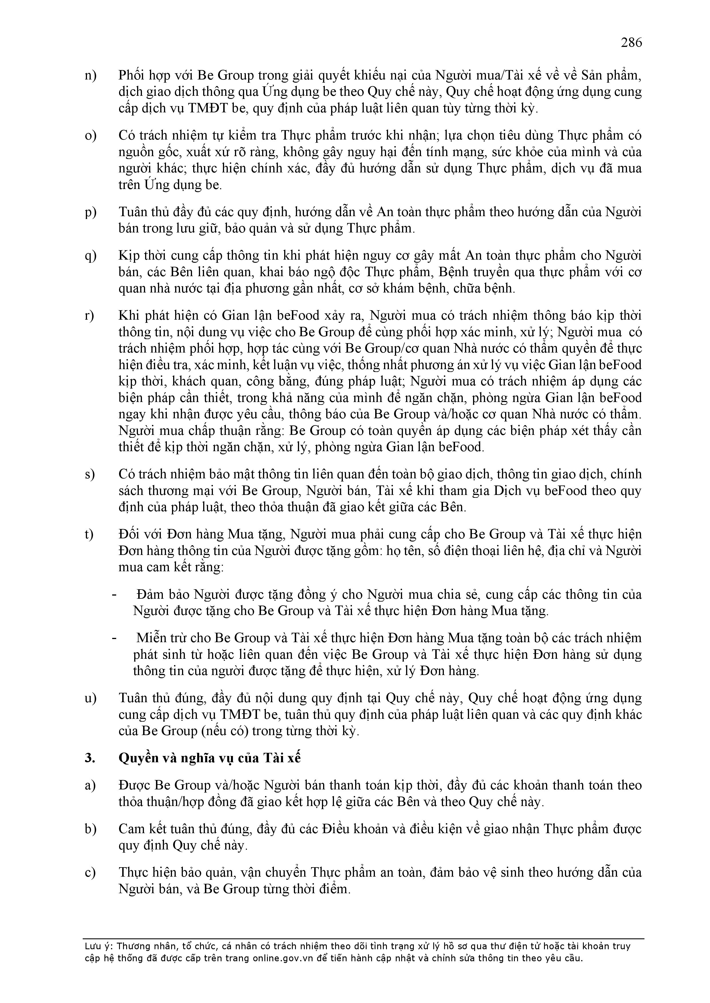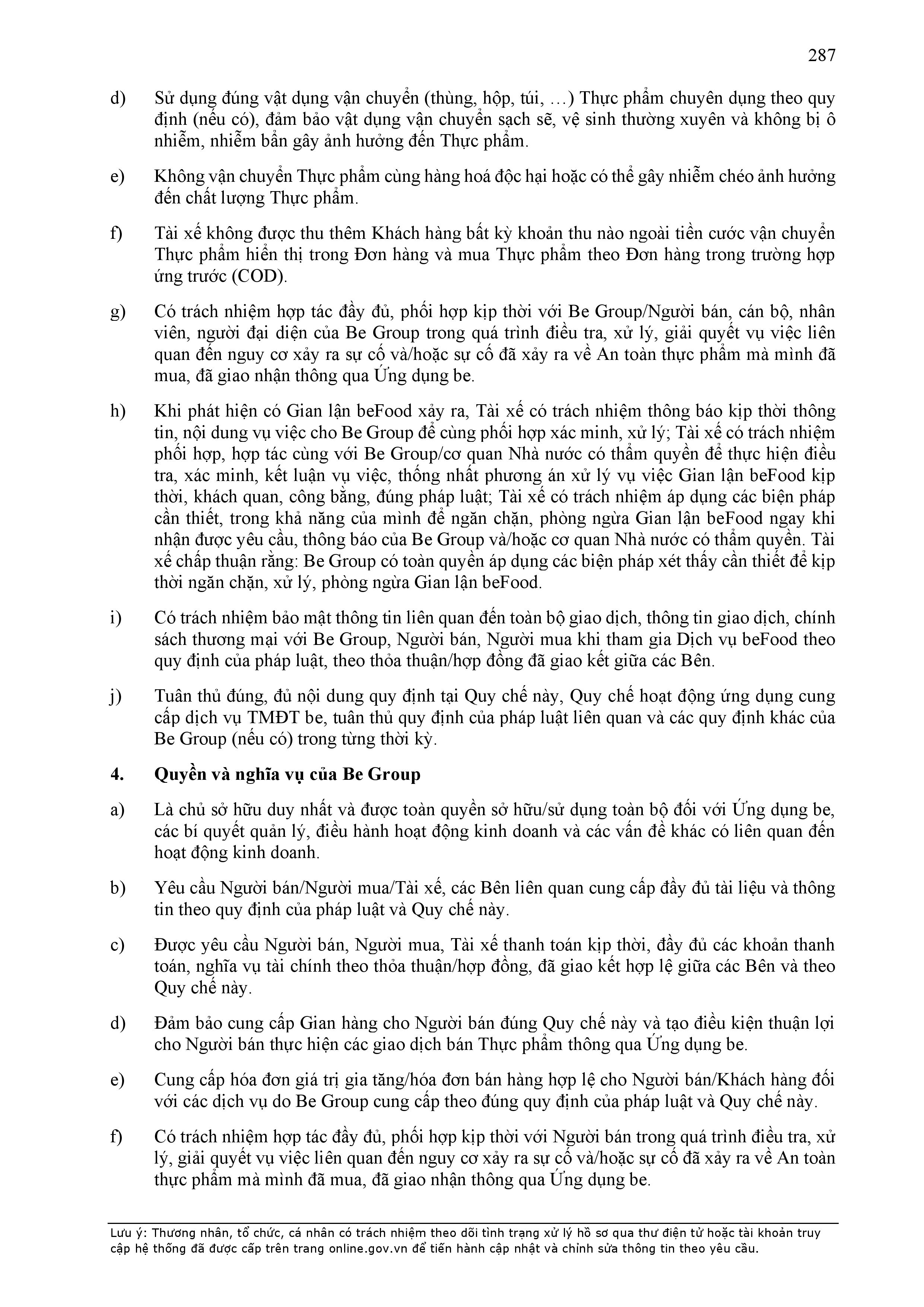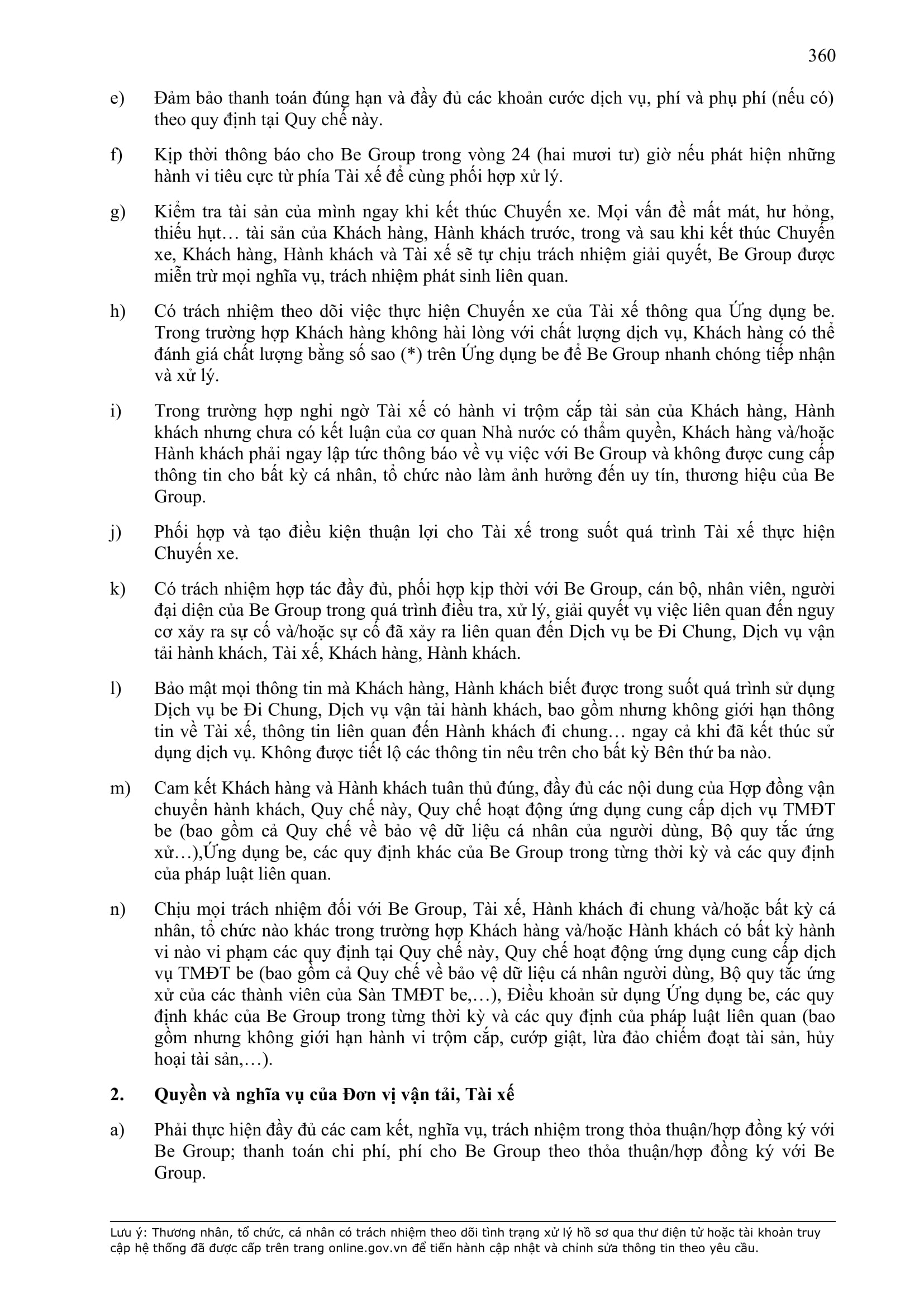 - Các nghĩa vụ, trách nhiệm khác theo Hợp Đồng này, các hợp đồng/thỏa thuận ký giữa Đơn Vị Vận Tải và BE GROUP, quy định pháp luật, Quy chế hoạt động ứng dụng cung cấp dịch vụ TMĐT be (bao gồm cả Quy chế về bảo vệ dữ liệu cá nhân người dùng, Bộ quy tắc ứng xử…), các quy định, quy chế khác của BE GROUP trong từng thời kỳ.