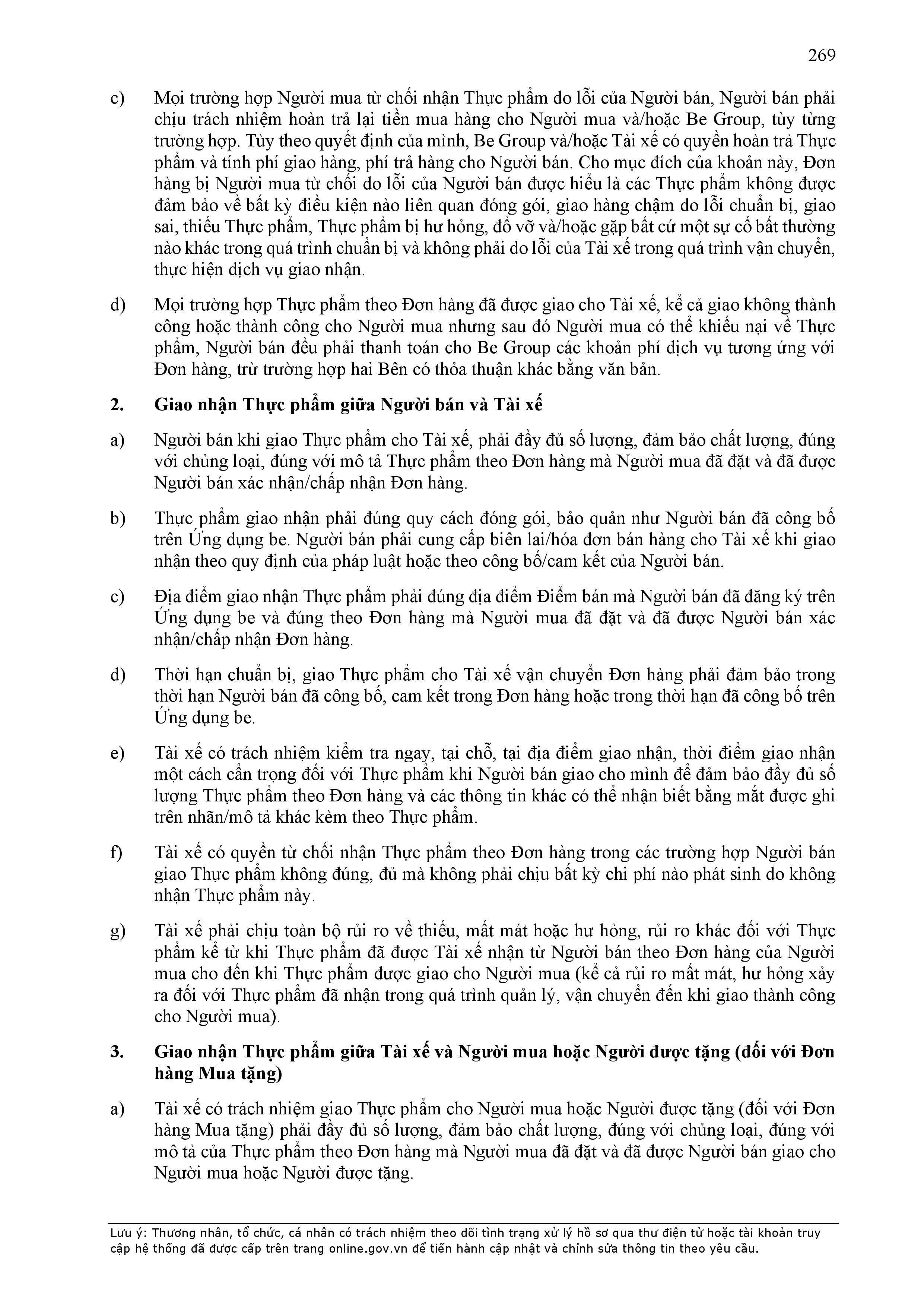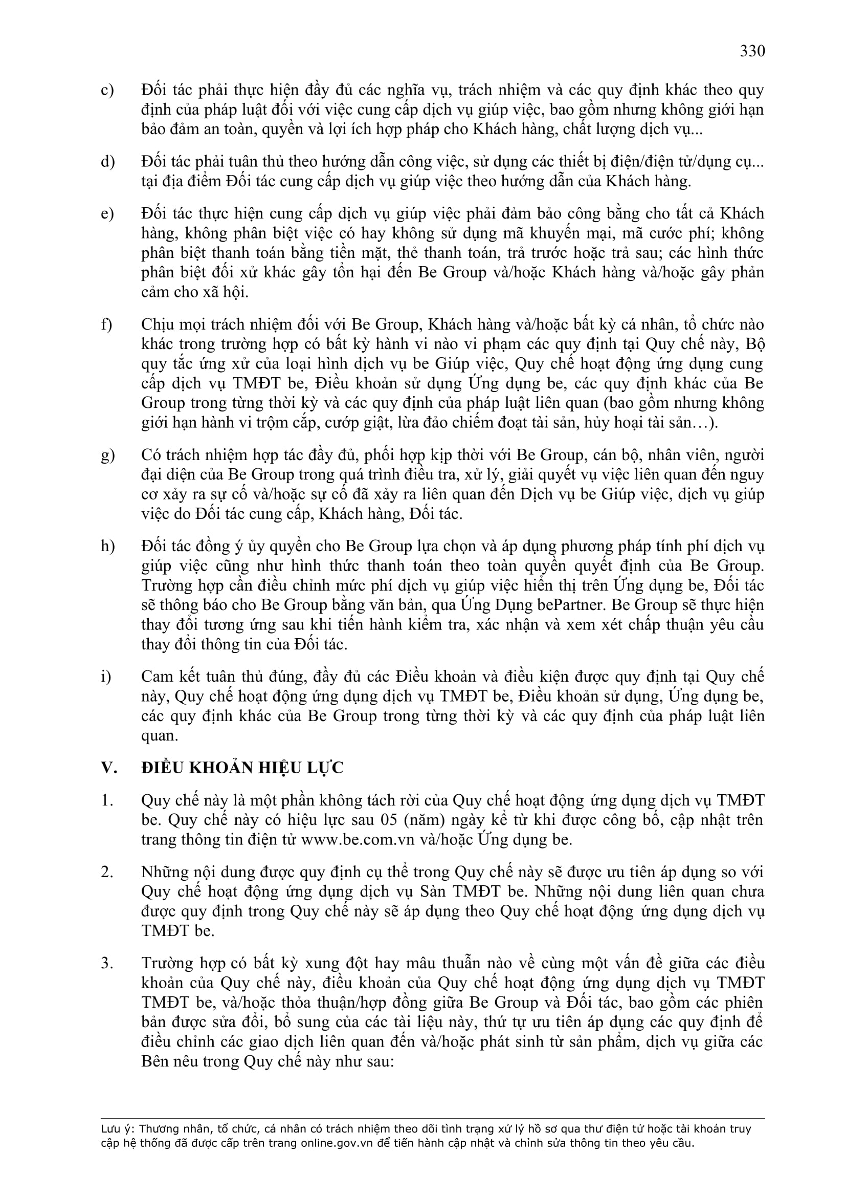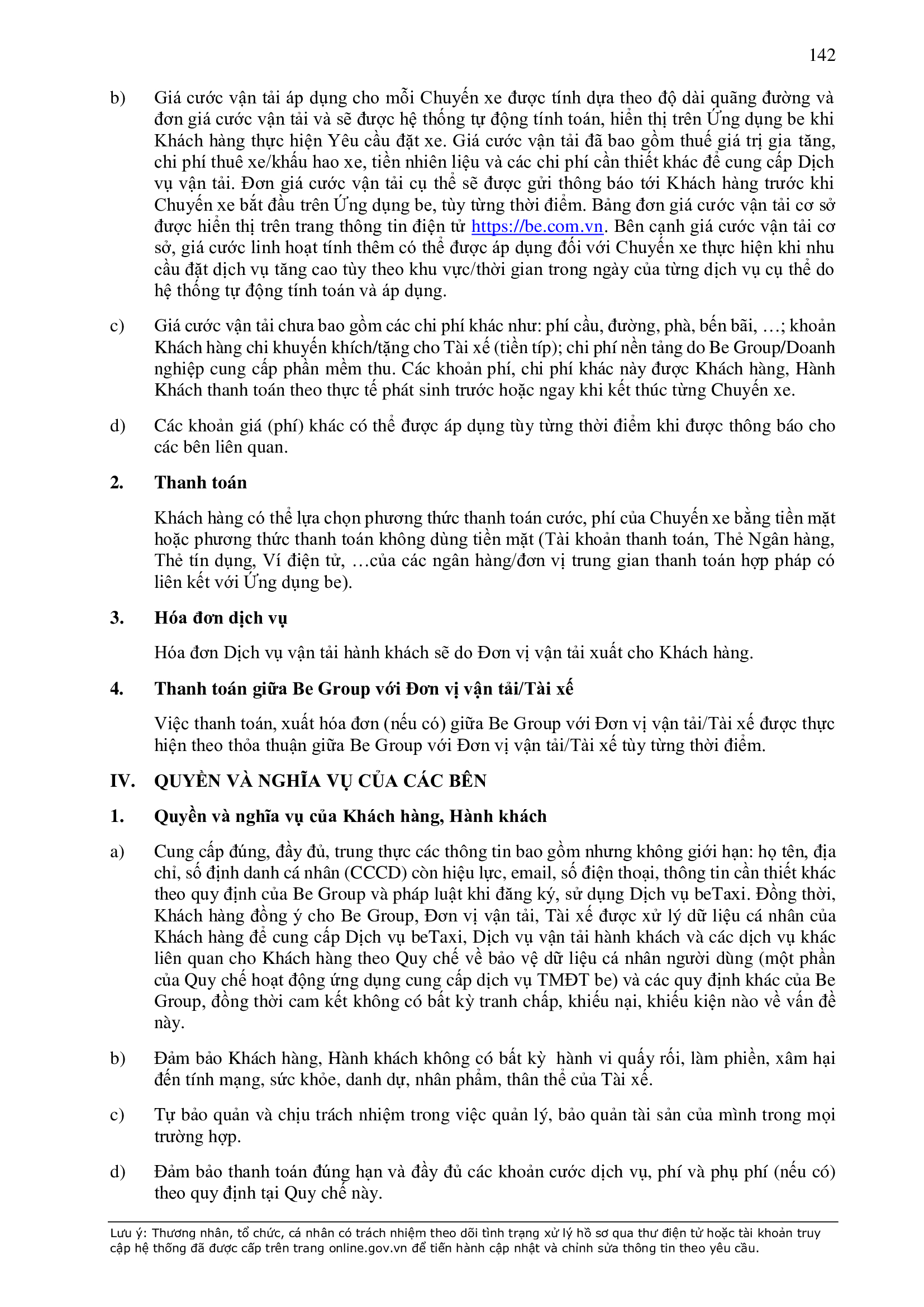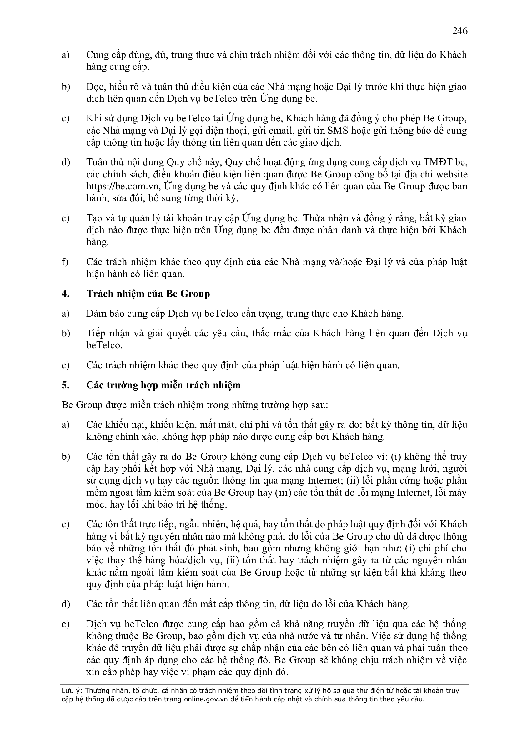 - Các nghĩa vụ, trách nhiệm khác theo Hợp Đồng này, các hợp đồng/thỏa thuận ký giữa Đơn Vị Vận Tải và BE GROUP, quy định pháp luật, Quy chế hoạt động ứng dụng cung cấp dịch vụ TMĐT be (bao gồm cả Quy chế về bảo vệ dữ liệu cá nhân người dùng, Bộ quy tắc ứng xử…), các quy định, quy chế khác của BE GROUP trong từng thời kỳ.