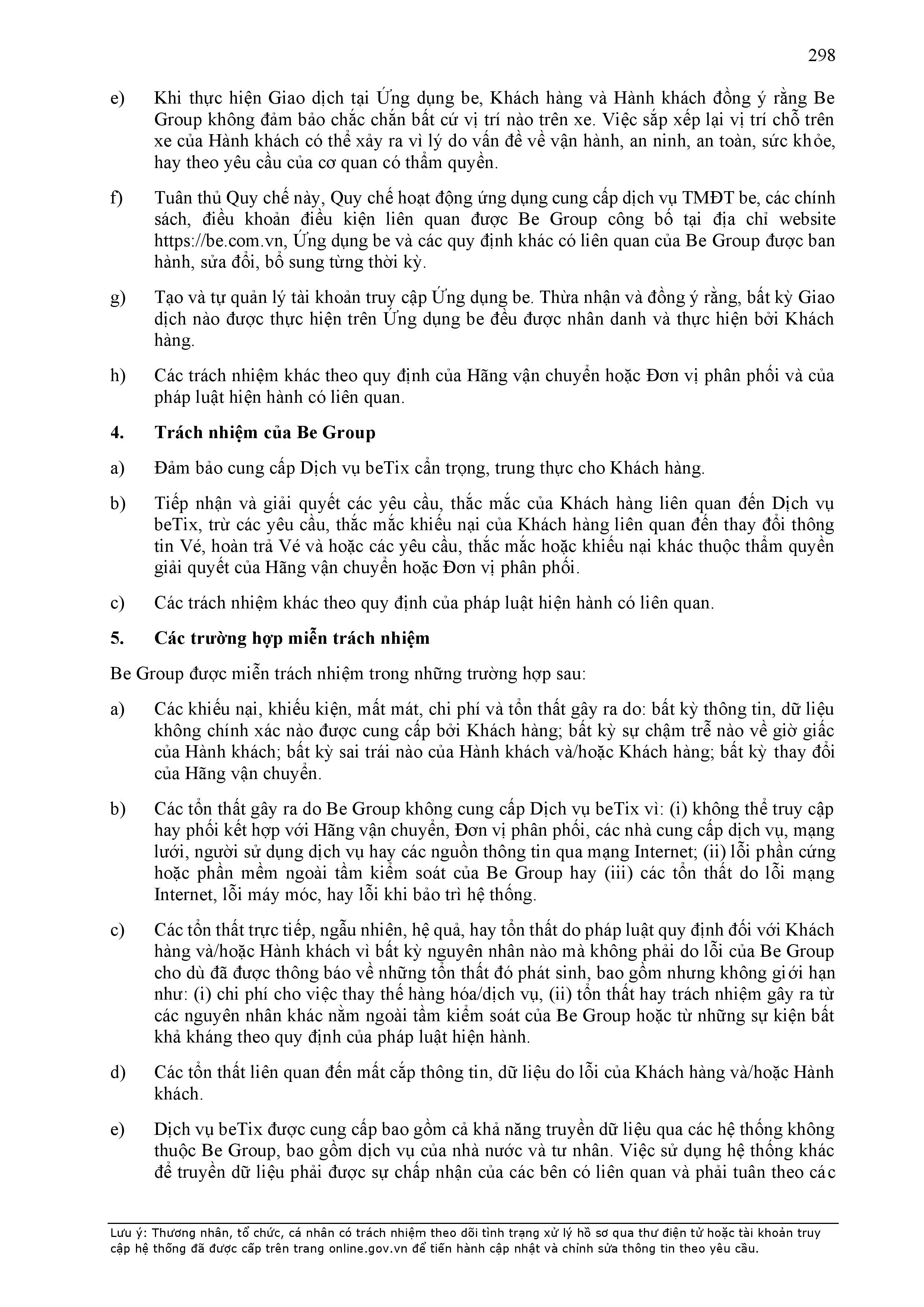 - Thừa nhận và đồng ý rằng, Đơn Vị Vận Tải là đơn vị chịu trách nhiệm trực tiếp điều hành phương tiện, Tài xế để cung cấp Dịch Vụ cho Khách Hàng và BE GROUP là đơn vị cung cấp phần mềm ứng dụng khoa học công nghệ hỗ trợ quản lý và kết nối hoạt động cung cấp Dịch Vụ cho Khách Hàng. Theo đó, BE GROUP sẽ không chịu bất kỳ nghĩa vụ, trách nhiệm nào bao gồm nhưng không giới hạn trách nhiệm pháp lý, trách nhiệm dân sự, trách nhiệm bảo hiểm và các loại trách nhiệm khác theo quy định của pháp luật áp dụng đối với Khách Hàng, hành khách và/hoặc bất kỳ bên thứ ba nào khác do phương tiện và/hoặc Tài xế và/hoặc Đơn Vị Vận Tải gây ra. Đơn Vị Vận Tải bằng chi phí của chính mình, sẽ là Bên chịu trách nhiệm và giải quyết mọi vấn đề phát sinh liên quan.