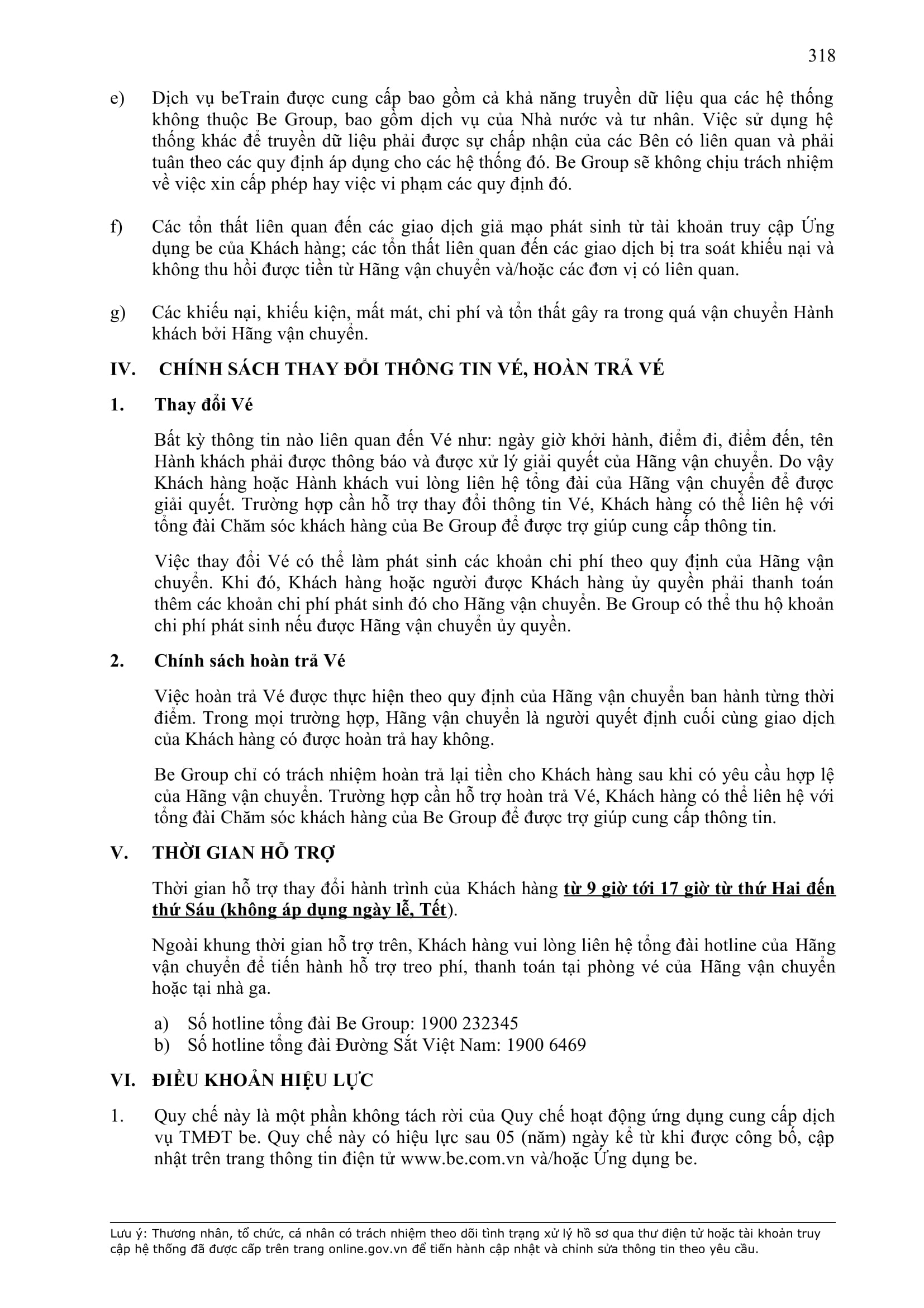 - Bất kỳ khiếu nại nào liên quan tới Dịch Vụ được cung cấp theo Hợp Đồng sẽ được Khách Hàng trình bày chi tiết và gửi tới BE GROUP (thay mặt cho Đơn Vị Vận Tải) bằng văn bản hoặc email (thư điện tử) tại Khoản 1 Điều này trong vòng 05 (năm) Ngày Làm Việc kể từ ngày xảy ra hoặc phát hiện ra sự việc dẫn tới việc khiếu nại.