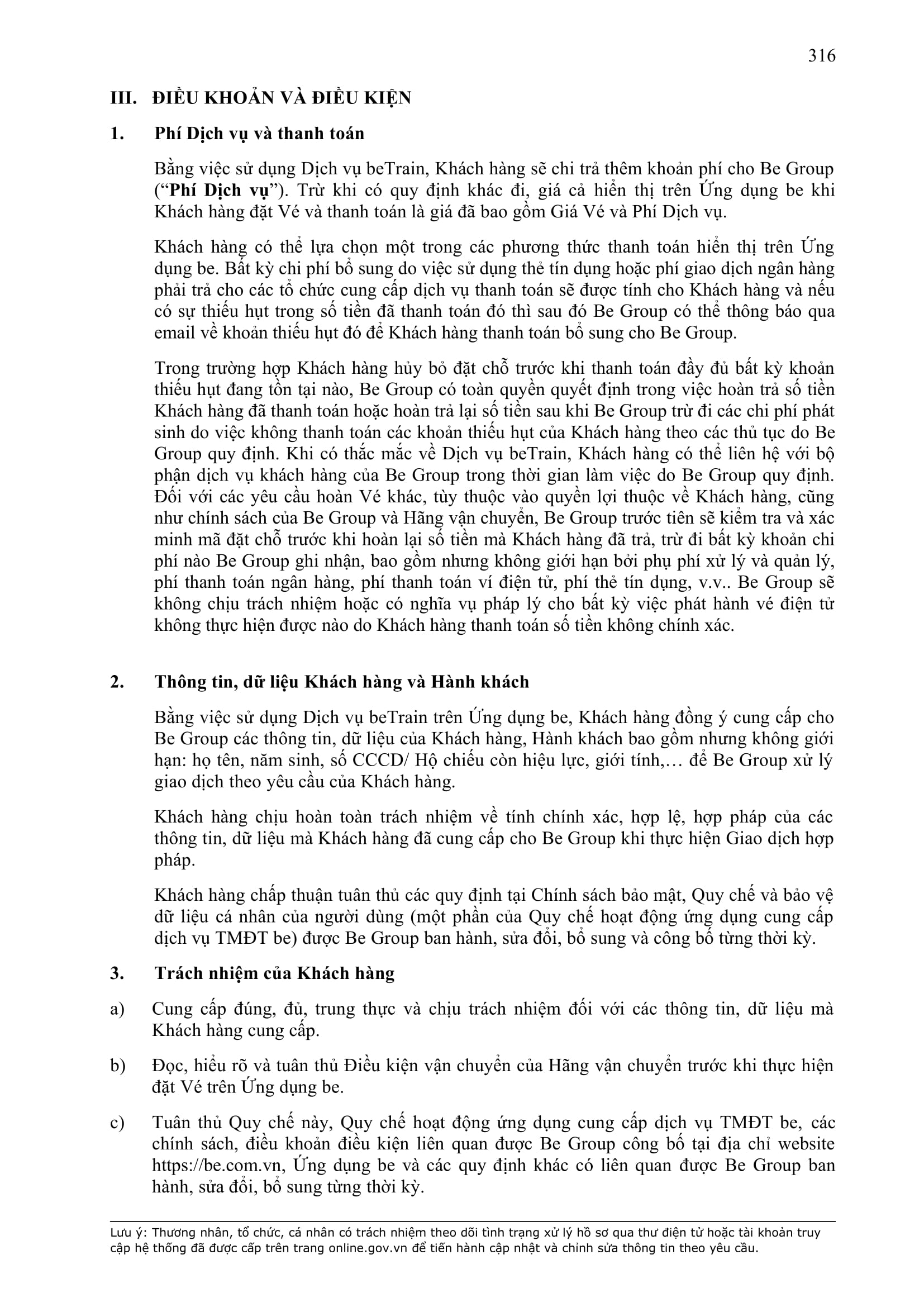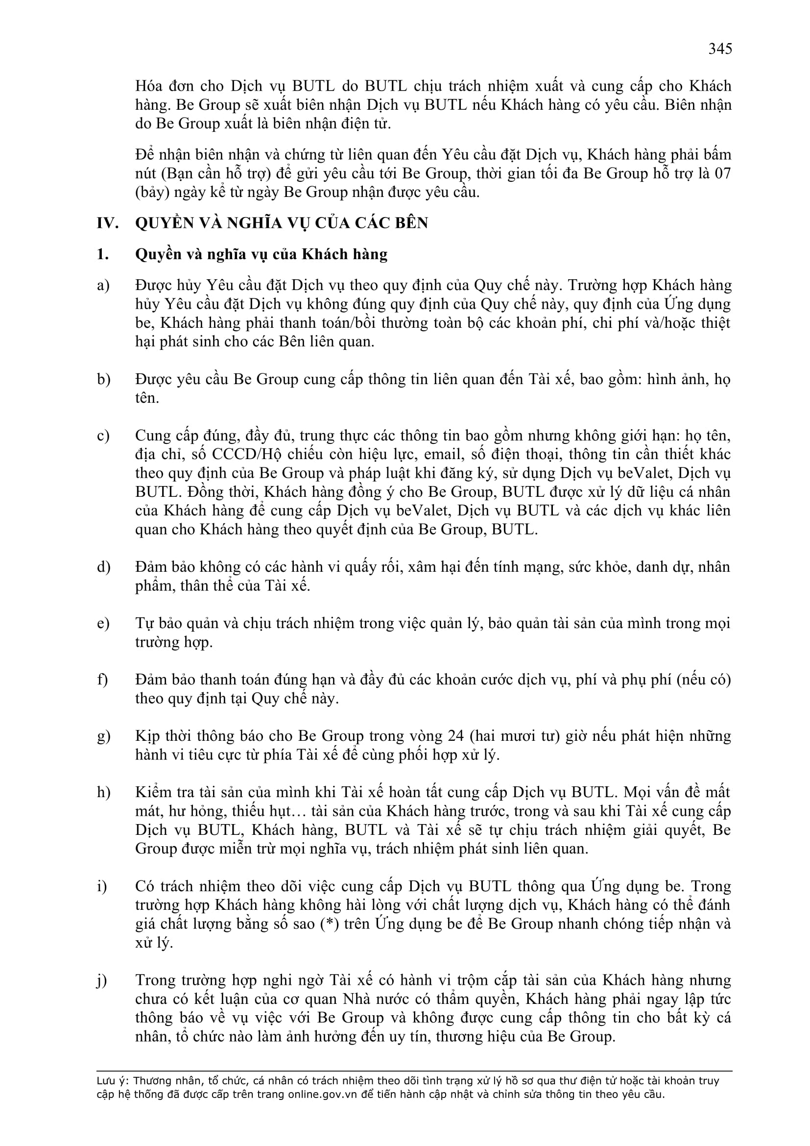 - Cung cấp đúng, đầy đủ, trung thực, kịp thời các thông tin bao gồm nhưng không giới hạn: họ tên, địa chỉ, số định danh cá nhân (CCCD) còn hiệu lực, email, số điện thoại, điểm đi, điểm đến, các thông tin cần thiết khác theo quy định của pháp luật khi đăng ký, sử dụng Dịch Vụ và giao kết Hợp Đồng này. Đồng thời, Khách Hàng hiểu và đồng ý cho BE GROUP, Đơn Vị Vận Tải, Tài xế được xử lý dữ liệu cá nhân của Khách Hàng để cung cấp Dịch Vụ và các dịch vụ khác liên quan cho Khách Hàng cũng như cho các mục đích khác theo Quy chế về bảo vệ dữ liệu cá nhân người dùng và các quy định khác của BE GROUP.