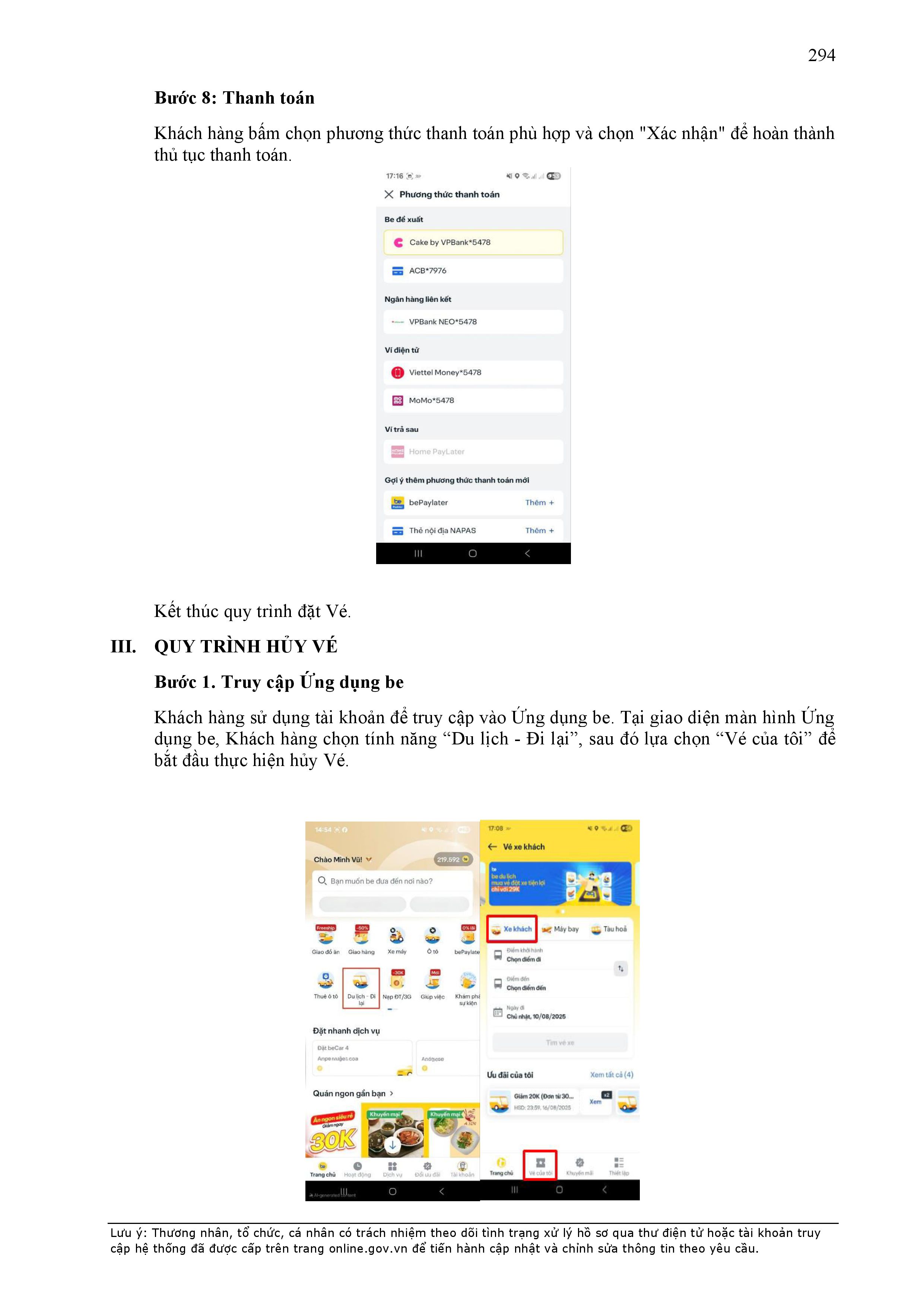 - Khách Hàng có thể lựa chọn một trong các phương thức thanh toán sau: Thanh toán bằng tiền mặt, thẻ ngân hàng, ví điện tử có liên kết với Ứng dụng be hoặc các phương thức thanh toán hợp lệ khác được hiển thị trên Ứng dụng be do Khách Hàng lựa chọn trước chuyến xe.