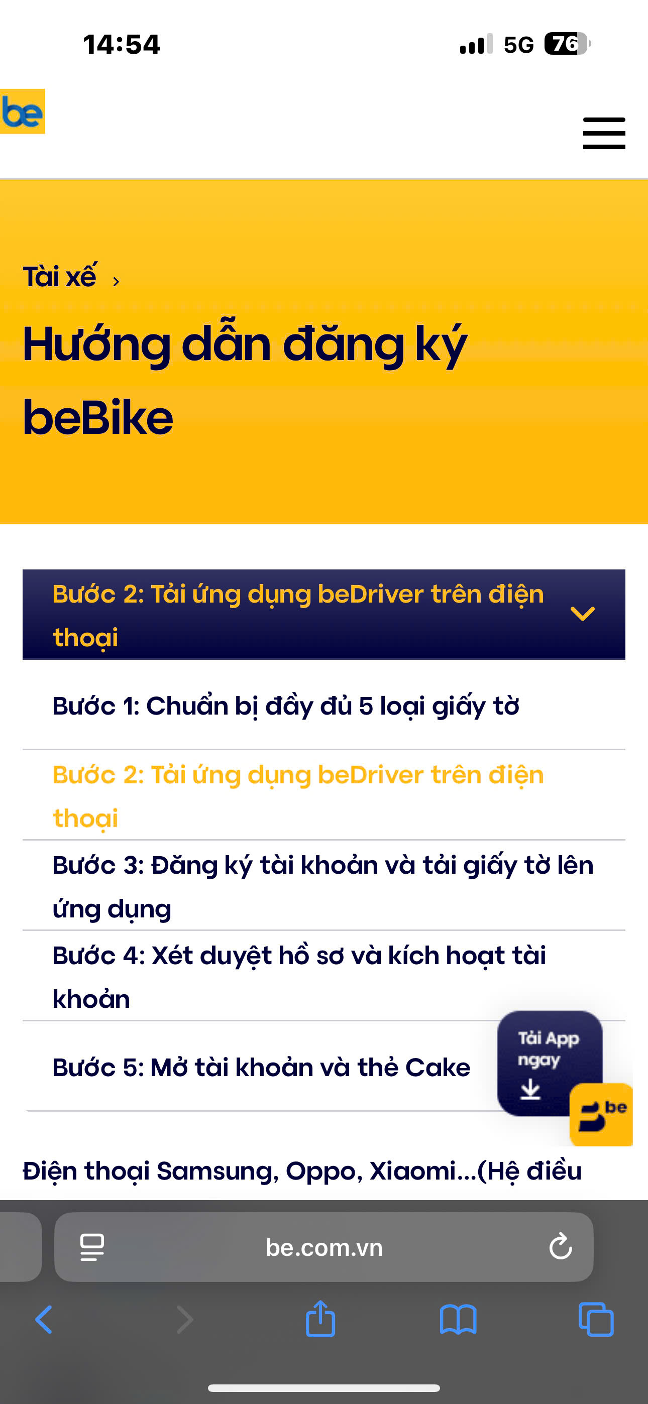 - 1. Quý tài xế kéo lên đầu trang, nhấn vào “Bước 2: Tải ứng dụng bePartner trên điện thoại”
