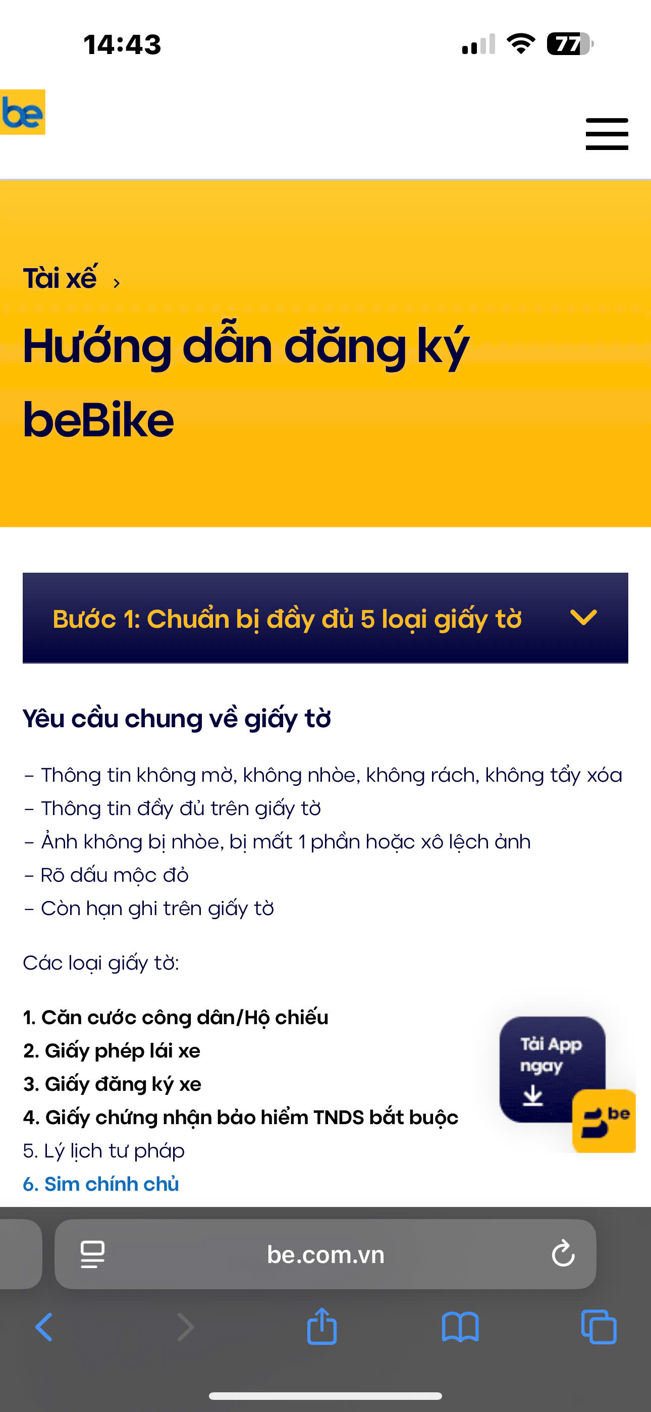 – Bản PHOTO GIẤY ĐĂNG KÝ XE (trong trường hợp cần thiết hoặc theo yêu cầu của cơ quan có thẩm quyền, Be Group có quyền yêu cầu tài xế xuất trình bản chính để đối chiếu trong 24h kể từ khi có yêu cầu)