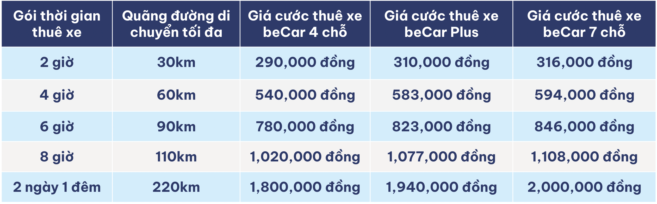 beRentals áp dụng giá cước cố định theo từng gói thời gian thuê tương ứng với quãng đường di chuyển tối đa mà khách hàng lựa chọn. Giá cước đã bao gồm thuế GTGT nhưng chưa bao gồm lệ phí cầu đường, phí sân bay, phí đỗ xe,… và các phụ phí khác (nếu có).
