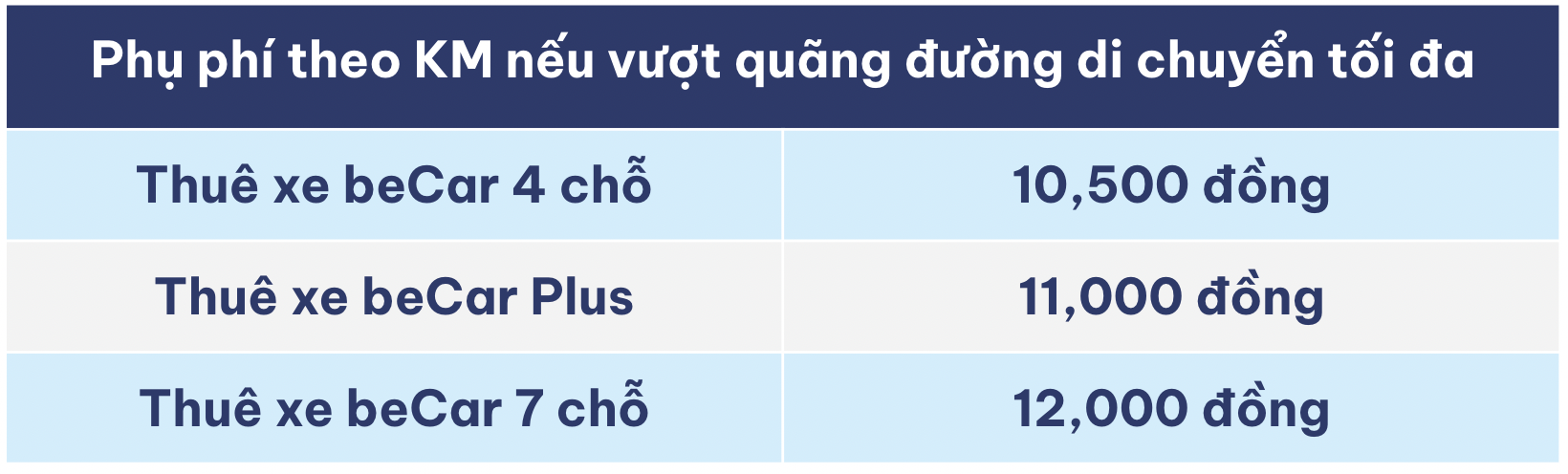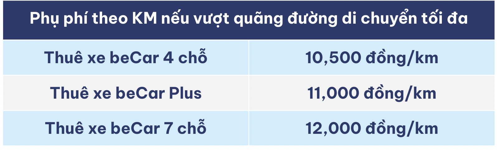 - Trường hợp di chuyển vượt quá quãng đường tối đa trong gói thuê, Tài xế có thể chủ động thương lượng phụ phí với khách hàng dựa trên quãng đường vượt thực tế.